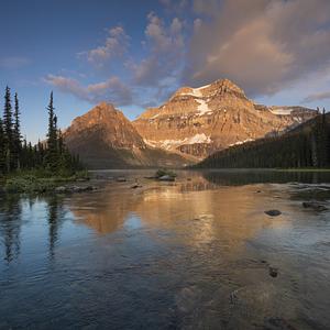 Mount Ball and the Coronet Towers bask in the sunrise glow of a beautiful June day. Photographed from the bridge over the outlet stream of Shadow Lake in Banff National Park.
