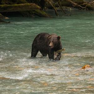 I recently had the privilege to travel to an isolated inlet on British Columbia's coast, for an unforgettable boat trip to see grizzlies feeding on salmon. Our informative (and entertaining!) guides led us to this mature male first. He had been through the wars, as one of his mangled ears shows, but he was still impressive, nonetheless. He expertly chased down several salmon, ignoring or releasing the males in favour of the roe-filled females. After consuming the skin, the roe and, possibly, the brain, the rest of the salmon was discarded. September 2024.