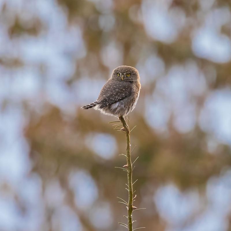A northern pygmy owl surveys his hunting territory from the tip of a small tree. Image created in February 2023.